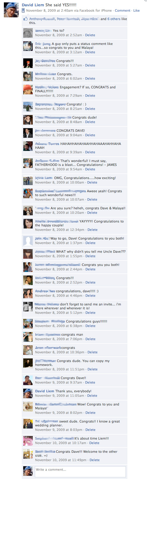 Ambiguous, yet obvious as to what the meaning was. The proposal was a well thought out plan, VERY few people knew of it, and I didn’t think about the repercussions of such an impersonal posting. Those who have not bought in to the world of social networks were the last to know. In retrospect, maybe I should not have posted it before telling some close friends and family, but I also didn’t expect so many people to be checking their Facebook “mini-feed” @ 3am in the morning.